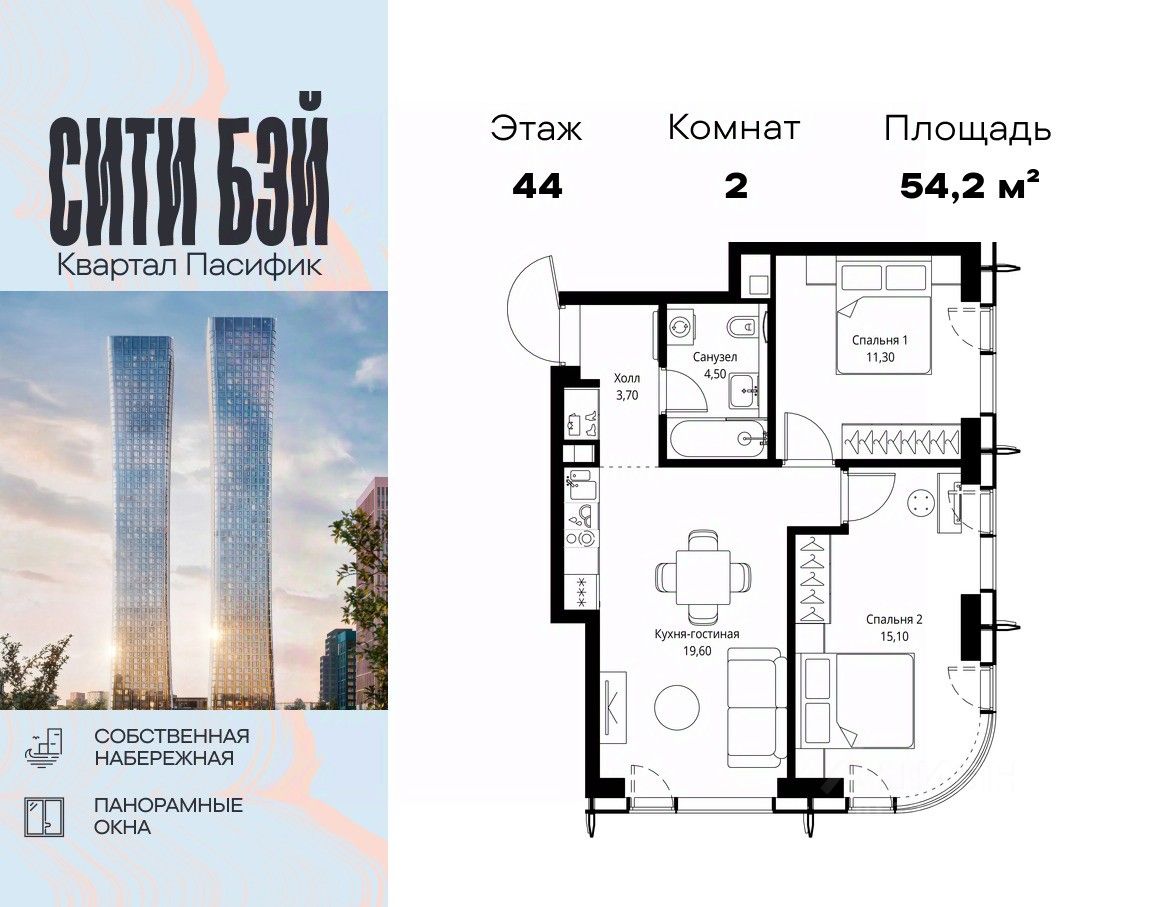 Продаётся 2-комнатная квартира общей площадью 54.20 м² без отделки в ЖК Сити Бэй, квартале Пасифик, на 44-м этаже 59 этажного дома.