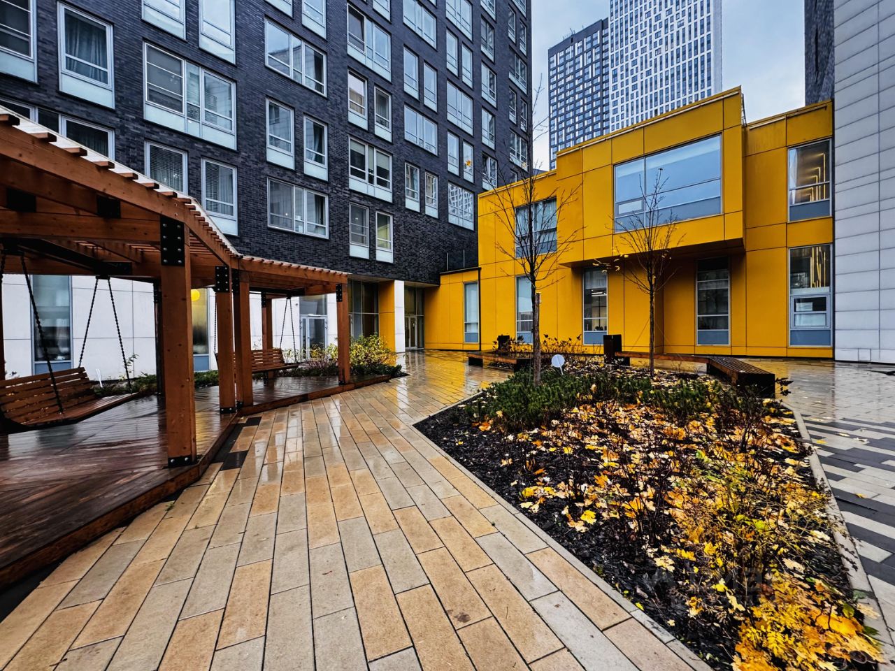 Внутренний благоустроенный двор с зонами отдыха, детской площадкой и зелёными аллеями;