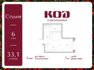В семейном жилом квартале, расположенном в окружении более 500 га леса и объектов исторического наследия, продается студия площадью 33.1 кв. м без отделки. Квартира расположена на 6 этаже 12-этажного корпуса 2.1 жилого квартала бизнес-класса КОД Сокольники от девелопера Новая Эра.