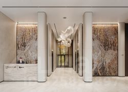 Лобби проекта наполнено светом и спокойствием - здесь хочется ненадолго задержаться, перевести дыхание. Мягкое освещение создают авторские светильники: они подчеркивают архитектуру пространства и не утомляют глаз. Акцентный элемент - мозаичное панно с растительным мотивом, выполненное из керамических пластин, которое придает интерьеру изысканность и художественную выразительность."
