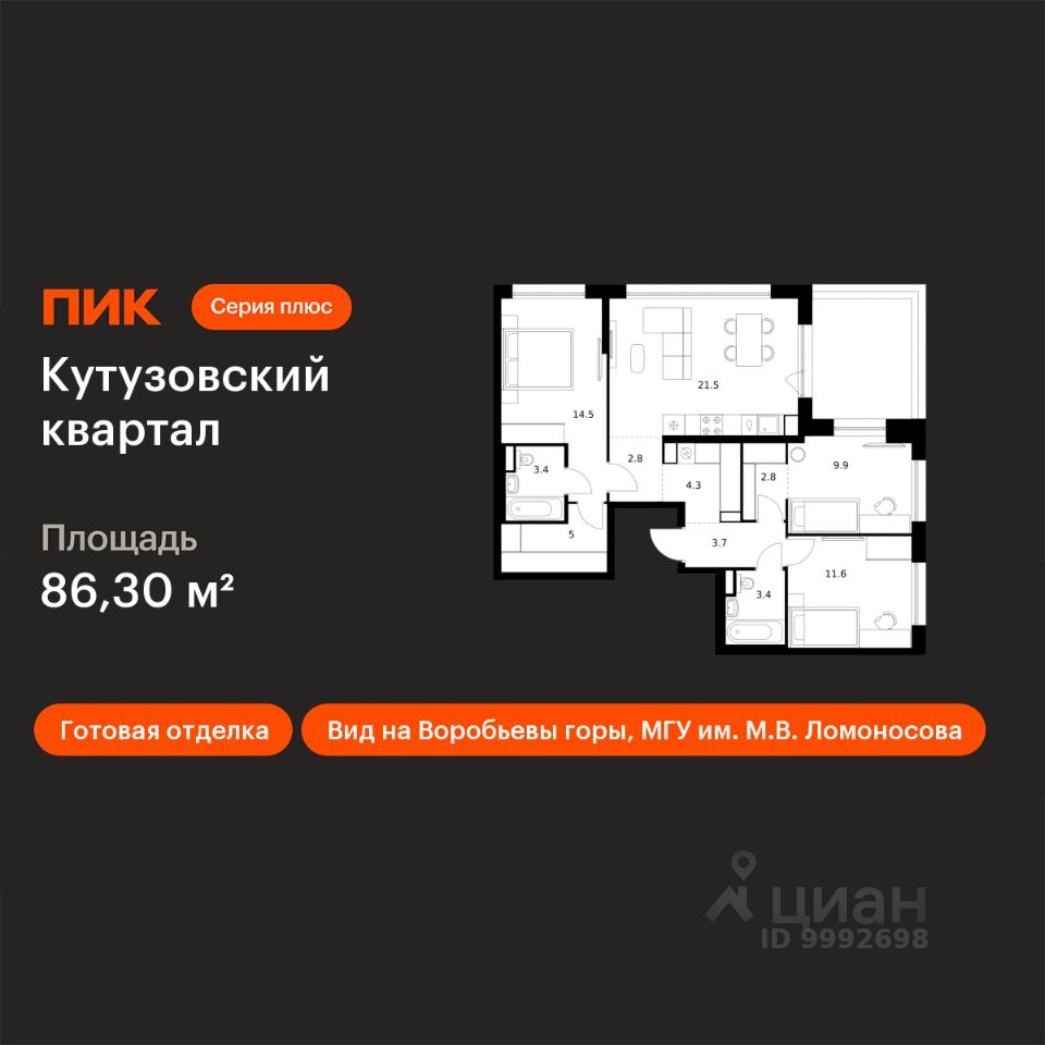 Продаётся 3-комн. квартира площадью 86,3 кв.м на 24 этаже 30 этажного дома (Корпус 3, Секция 2) проекта ПИК Кутузовский квартал. Светлый просторный подъезд на уровне земли, функциональная планировка, большие окна, c отделкой.