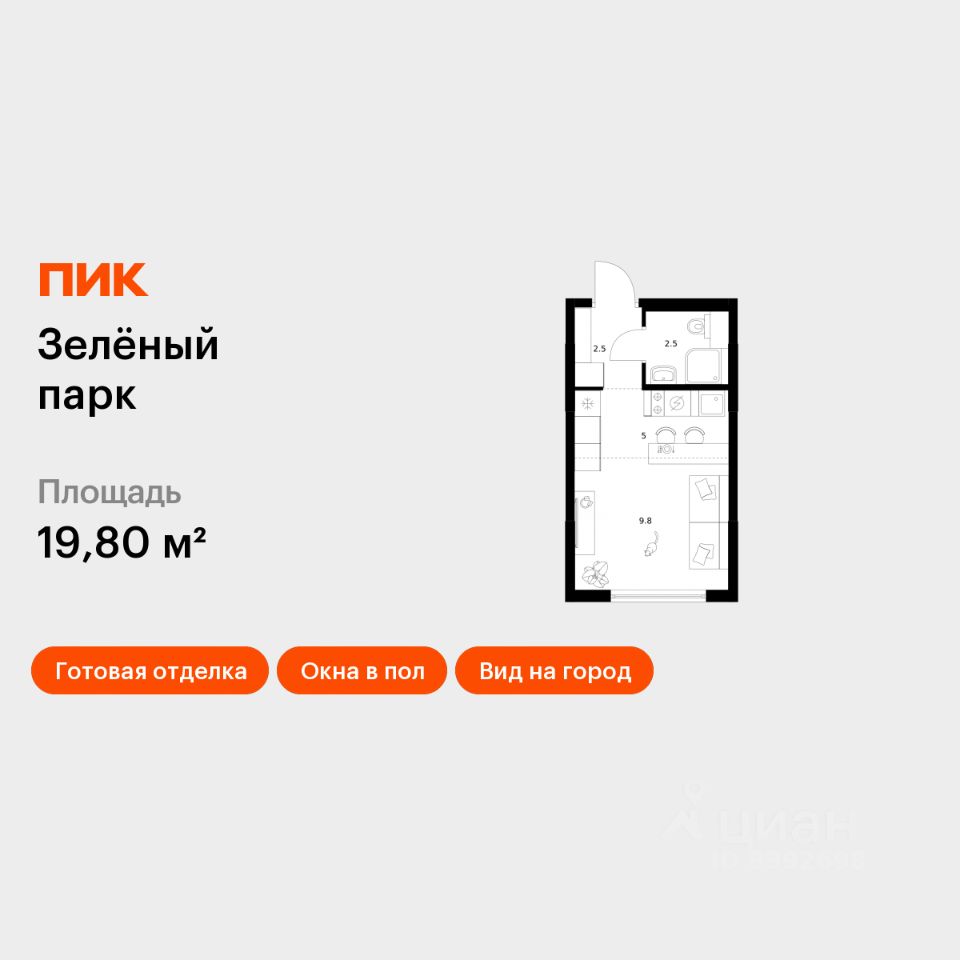 Продаётся квартира-студия площадью 19,8 кв.м на 22 этаже 25 этажного дома (Корпус 6.2, Секция 1) проекта ПИК Зелёный парк. Светлый просторный подъезд на уровне земли, функциональная планировка, большие окна, c отделкой.