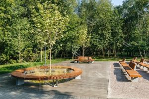 На крыше двухуровневого подземного паркинга расположен зеленый ландшафтный парк с лаунж-зонами, детскими и спортивными площадками.