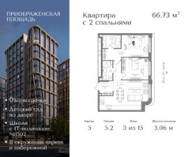 Квартира на 3 этаже в жилом комплексе премиум-класса "Преображенская площадь". Общая площадь: 66.73 кв.м.
