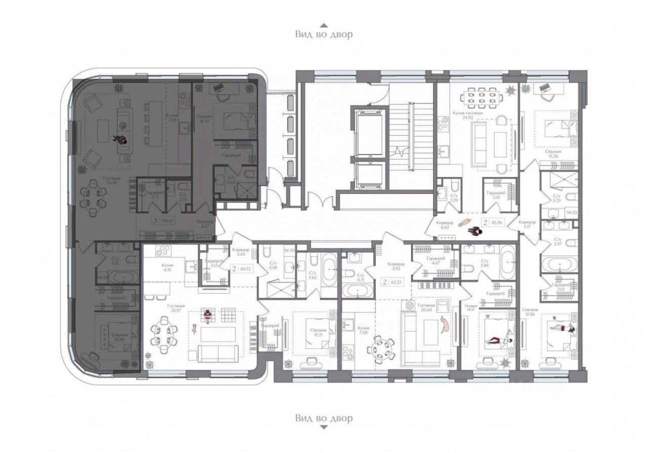 Внутренний двор 1,5 га функциональное и безопасное пространство для игр, работы и занятий спортом. Пешеходный променад для прогулок. Дома переменной этажности. Есть подземный паркинг.