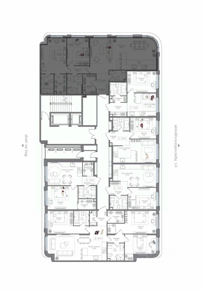Внутренний двор 1,5 га функциональное и безопасное пространство для игр, работы и занятий спортом. Пешеходный променад для прогулок. Дома переменной этажности. Есть подземный паркинг.