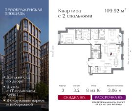 Квартира на 8 этаже в жилом комплексе премиум-класса "Преображенская площадь". Общая площадь: 109.92 кв.м.