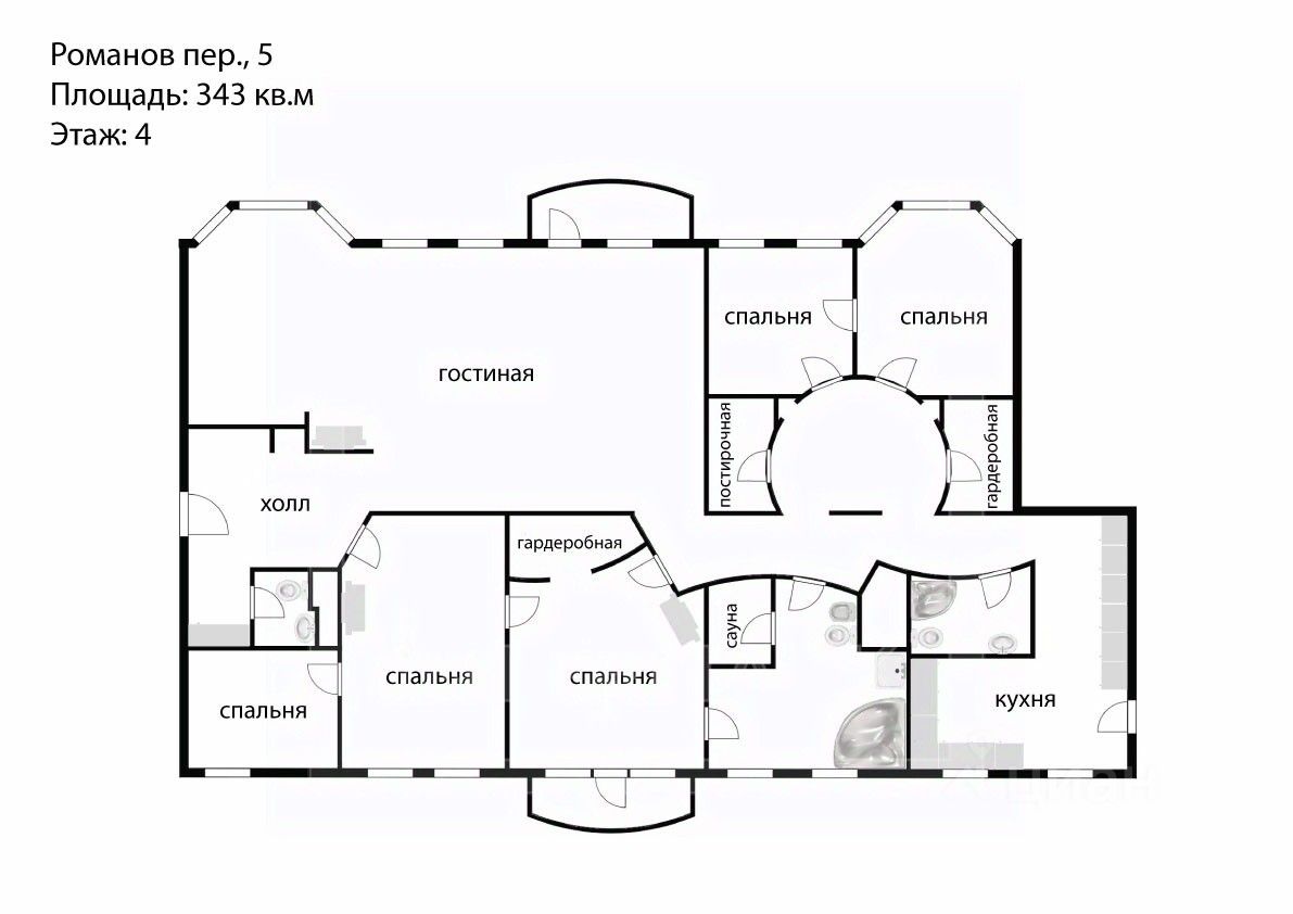 ID 61348: Эксклюзив. Только в Intermark. ЖК Романов 5. 6-комнатная квартира в знаменитом доходном доме после полной реконструкции в Романовом переулке, 5. Планировкой предусмотрены гостиная (100 кв.м.), 5 спален, 2 балкона, встроенные гардеробные комнаты, постирочная комната, черный ход. В квартире 3 рабочих камина, сауна, домашний кинотеатр, встроенная акустическая система, встроенная система кондиционирования.