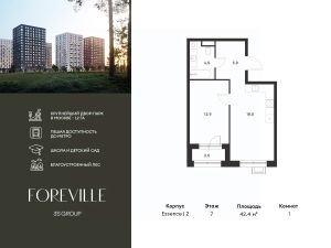 Предчистовая отделка в подарок! Пешая доступность от метро и московская прописка! Продается уютная 1-комн. квартира площадью 42,4 кв.м на 7 этаже 17 этажного жилого комплекса бизнес-класса Foreville от 3S Group.