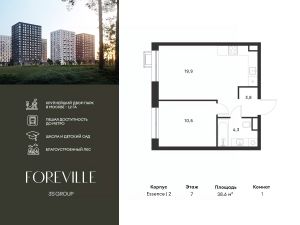 Предчистовая отделка в подарок! Пешая доступность от метро и московская прописка! Продается уютная 1-комн. квартира площадью 38,6 кв.м на 7 этаже 17 этажного жилого комплекса бизнес-класса Foreville от 3S Group.