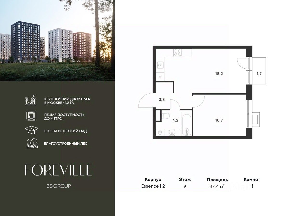 Предчистовая отделка в подарок! Пешая доступность от метро и московская прописка! Продается уютная 1-комн. квартира площадью 37,4 кв.м на 9 этаже 17 этажного жилого комплекса бизнес-класса Foreville от 3S Group.