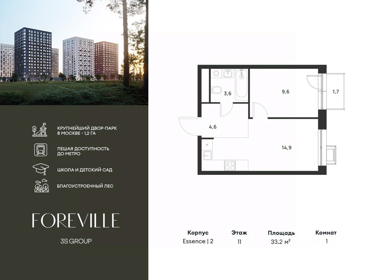 Предчистовая отделка в подарок! Пешая доступность от метро и московская прописка! Продается уютная 1-комн. квартира площадью 33,2 кв.м на 11 этаже 17 этажного жилого комплекса бизнес-класса Foreville от 3S Group.
