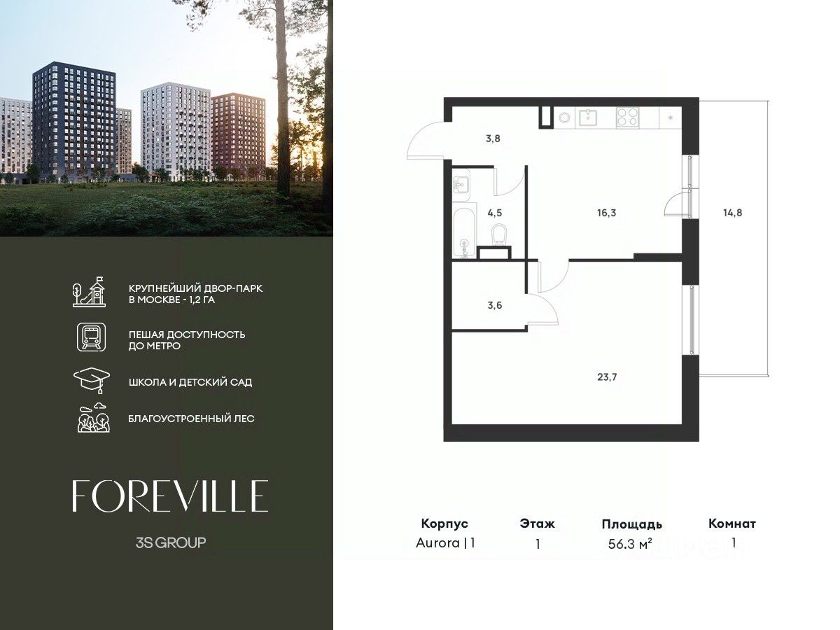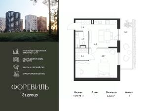 Продается уютная 1-комн. квартира площадью 56,3 кв.м на 1 этаже 17 этажного жилого комплекса бизнес-класса Foreville от 3S Group.