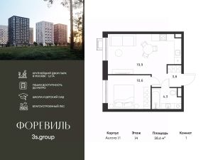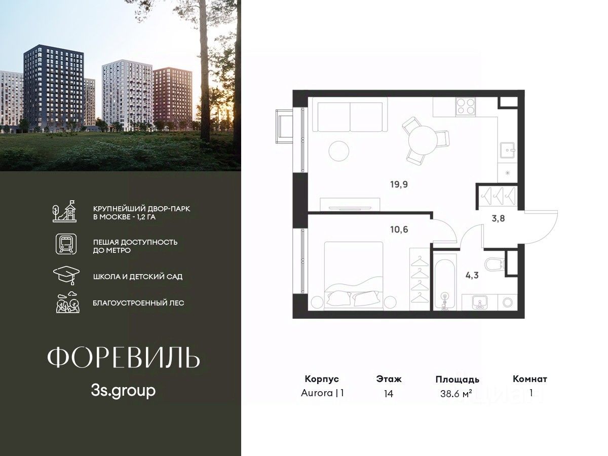 Продается уютная 1-комн. квартира площадью 38,6 кв.м на 14 этаже 17 этажного жилого комплекса бизнес-класса Foreville от 3S Group.