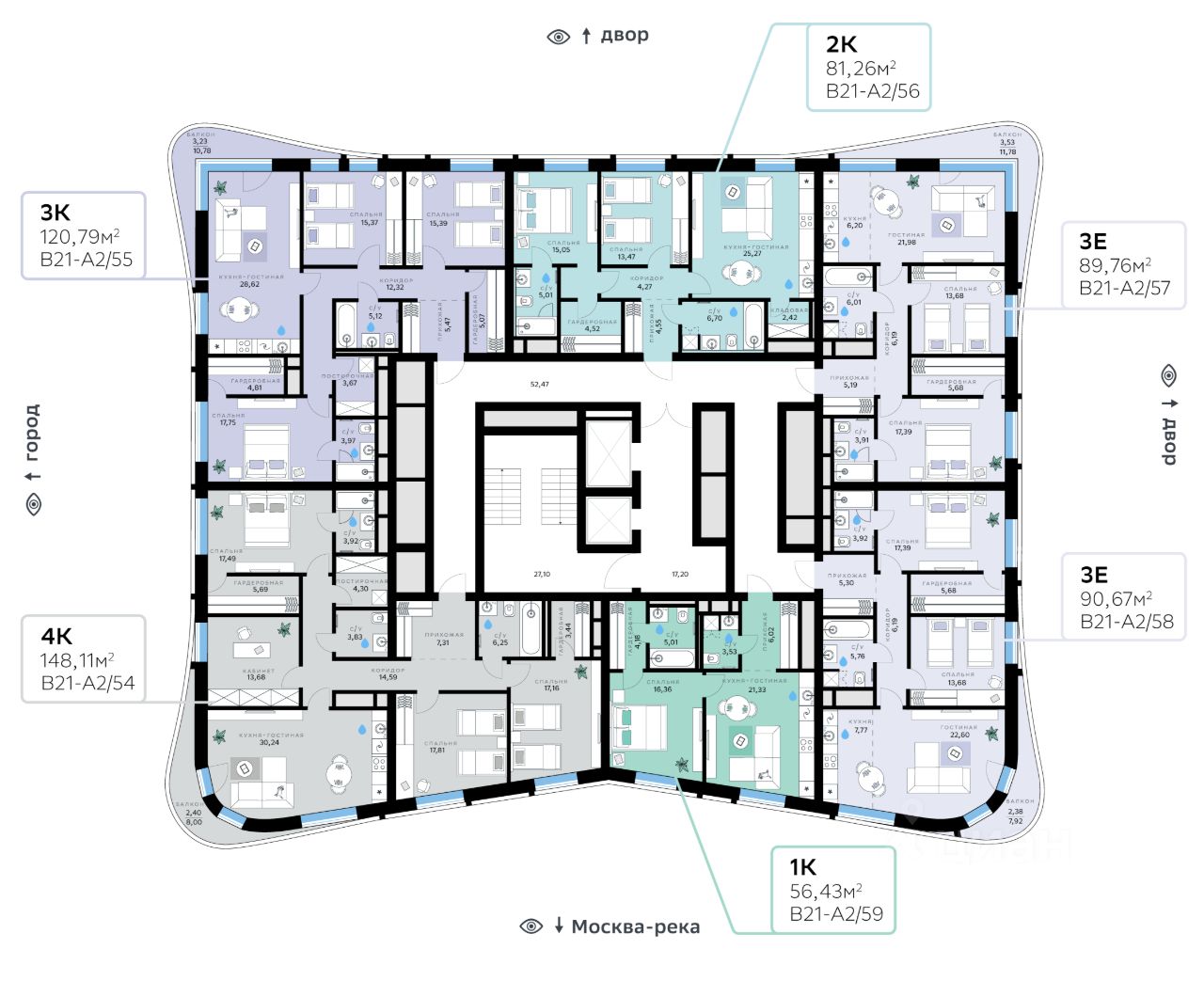 В продаже — двухкомнатная квартира, общей площадью 81,26 кв. м. Квартира расположена на десятом этаже тринадцатиэтажной секции корпуса класса Адвансд в новом районе СберСити, который строит Сбер. Дом находится на второй береговой линии Москвы-реки.