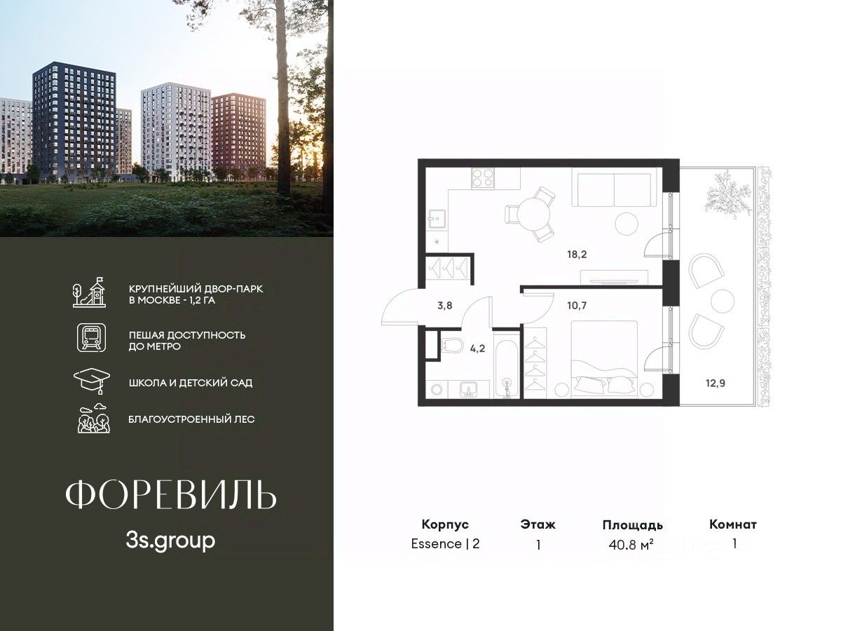Предчистовая отделка в подарок! Пешая доступность от метро и московская прописка! Продается уютная 1-комн. квартира площадью 40,8 кв.м на 1 этаже 17 этажного жилого комплекса бизнес-класса Foreville от 3S Group.