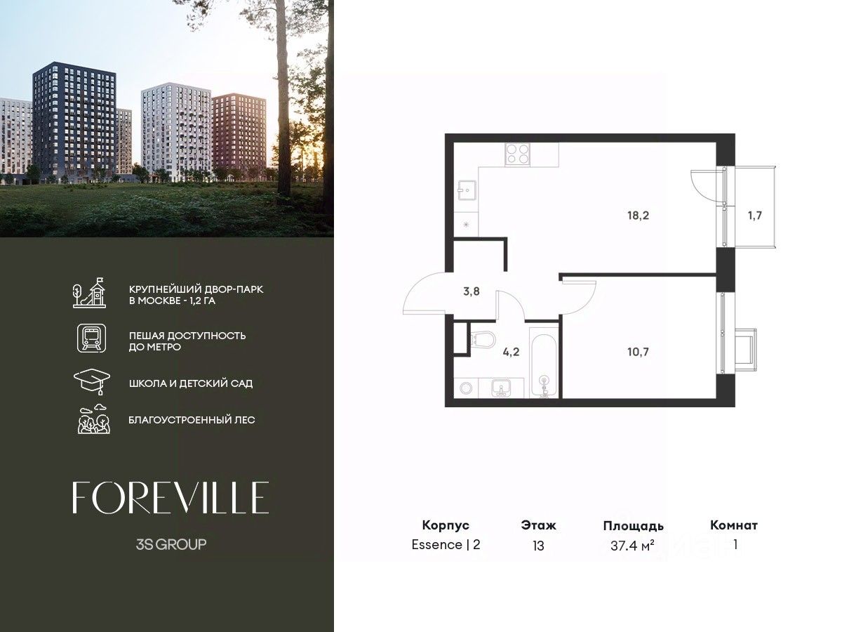 Предчистовая отделка в подарок! Пешая доступность от метро и московская прописка! Продается уютная 1-комн. квартира площадью 37,4 кв.м на 13 этаже 17 этажного жилого комплекса бизнес-класса Foreville от 3S Group.