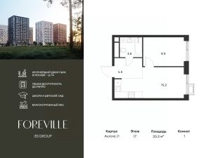 Продается уютная 1-комн. квартира площадью 33,3 кв.м на 17 этаже 17 этажного жилого комплекса бизнес-класса Foreville от 3S Group.