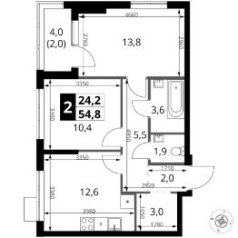 Продаётся 2-к квартира номер 31 общей площадью 54.8 кв.м. на 6-м этаже 16 этажного здания. Без отделки.