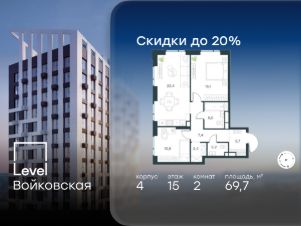 Продается 2-комнатная квартира площадью 69.70 кв. м с отделкой. Квартира находится на 15 этаже 26-этажного корпуса 4, в новом жилом комплексе бизнес-класса Level Войковская, расположенном рядом с живописным заповедником "Покровское-Стрешнево" (застройщик - компания Level Group/Левел групп).