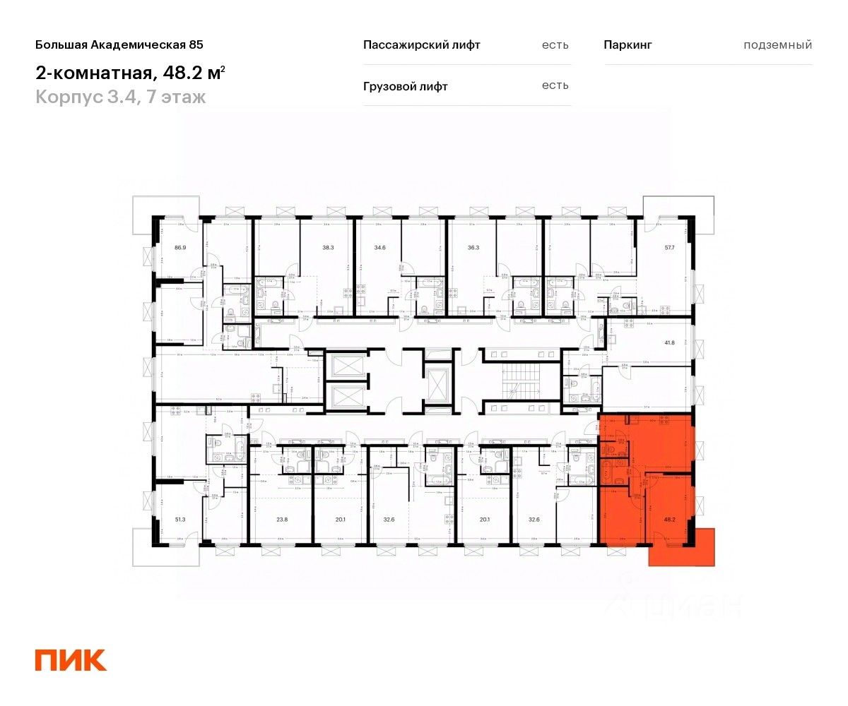 Продаётся 2-комн. квартира площадью 46,4 кв.м на 7 этаже 24 этажного дома (Корпус 3.4, Секция 7) проекта ПИК Большая Академическая 85. Светлый просторный подъезд на уровне земли, функциональная планировка, большие окна, предчистовая отделка.