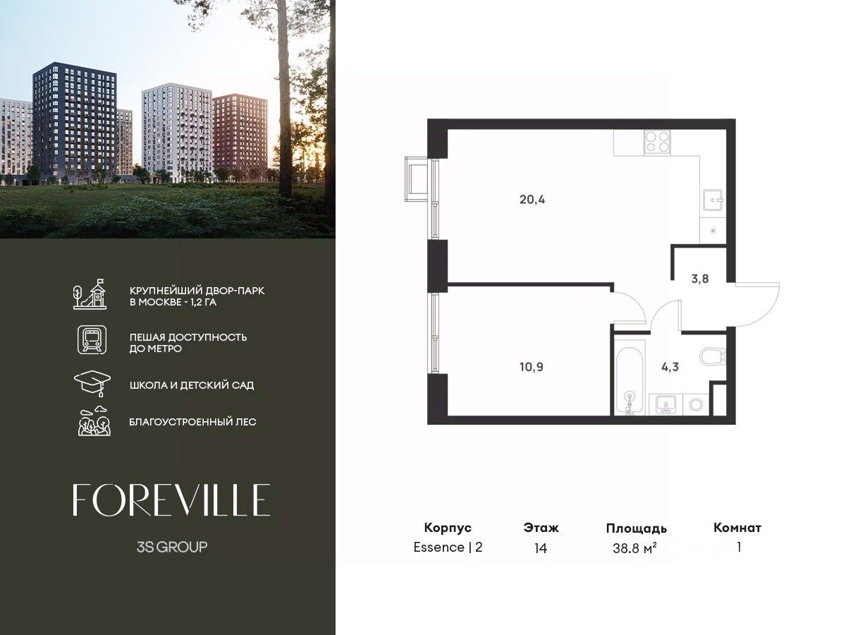 Предчистовая отделка в подарок! Пешая доступность от метро и московская прописка! Продается уютная 1-комн. квартира площадью 38,8 кв.м на 14 этаже 17 этажного жилого комплекса бизнес-класса Foreville от 3S Group.