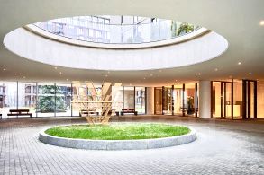 Закрытая территория включает приватный сад с местами для отдыха и прогулок, детские и спортивные площадки. Инфрастуктура комплекса: детский сад, фитнес-центр, бассейн и спа, зал для йоги, теннисный корт, столы для настольного тенниса, бильярдные, баскетбольная площадка, ресторан и кофейня, арт-классы, салоны красоты, отель для питомцев.