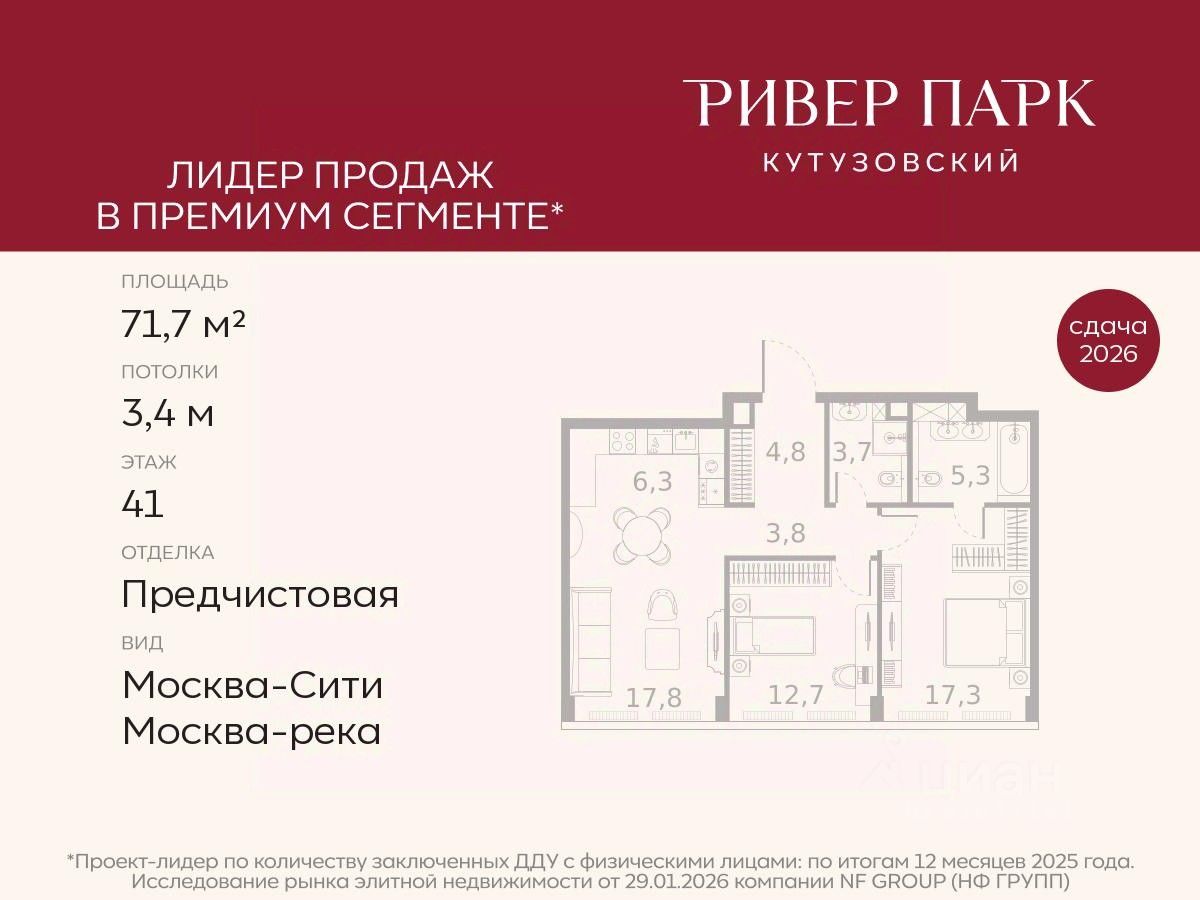 Продается 2-к квартира площадью 71.7 кв.м. на 41-м этаже в жилом комплексе премиум-класса Ривер Парк Кутузовский в Башне Изумруд