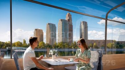 На территории комплекса создано уникальное благоустройство: английский сад, цветущие поляны, зеленый лабиринт, зоны для отдыха и современные детские площадки. Первые этажи корпусов и стилобат займут коммерческие помещения, включая магазины и кафе. Закрытая охраняемая территория 2 детских сада на 100 мест. Школа на 400 мест. Набережная Москва-реки в 10 минутах пешком