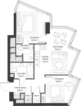 Предлагается 2к-квартира общей площадью 59.7 кв.м в ЖК hideOUT.