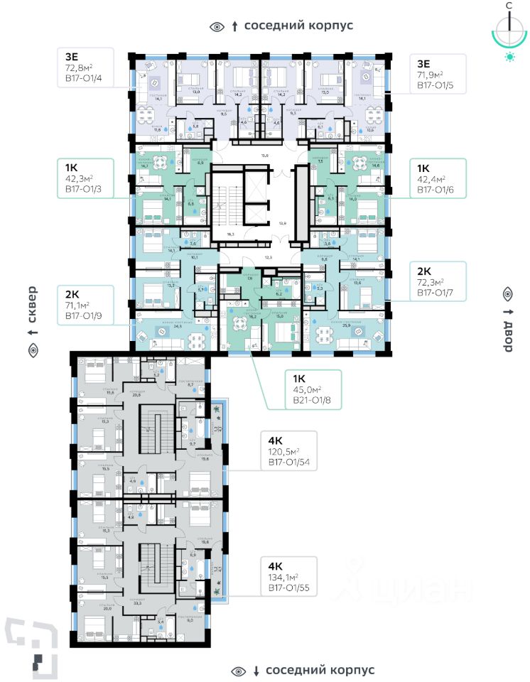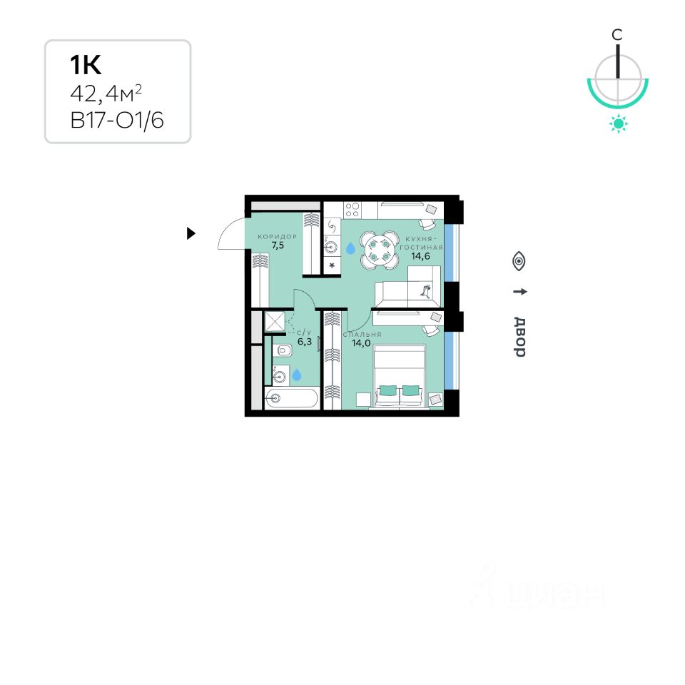 В продаже — однокомнатная квартира, общей площадью 42,4 кв. м. Квартира расположена на втором этаже десятиэтажного дома класса Оптимум в квартале В17 нового района СберСити, который строит Сбер. Всего в доме — 55 квартир.