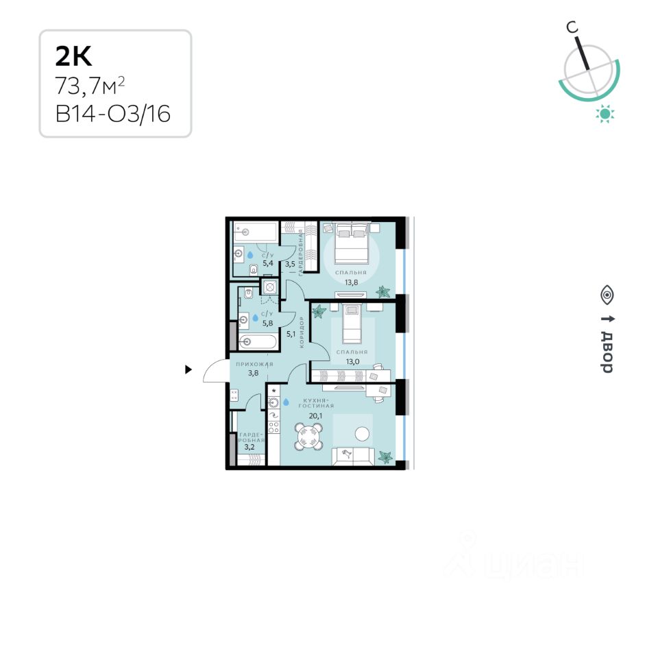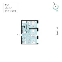 В продаже — двухкомнатная квартира с чистовой отделкой, общей площадью 73,7 кв. м. Квартира расположена на третьем этаже десятиэтажного корпуса Оптимум в квартале В14 нового района СберСити, который строит Сбер.