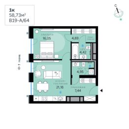 В продаже — однокомнатная квартира, общей площадью 58,73 кв. м. Квартира расположена на втором этаже двенадцатиэтажной секции корпуса класса Адвансд в новом районе СберСити, который строит Сбер. Дом находится на второй береговой линии Москвы-реки.