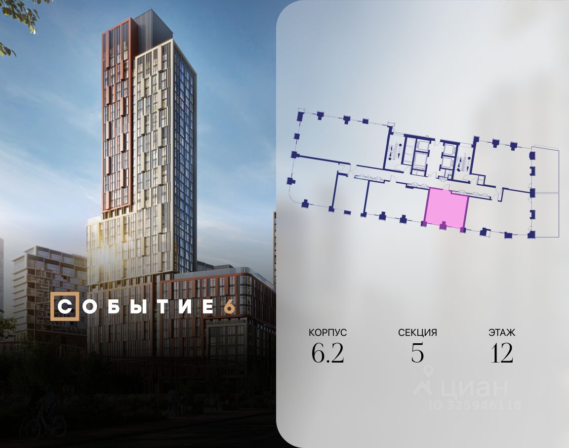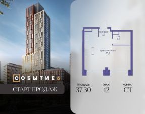 Продаётся квартира-студия от застройщика: общая площадь 37.30 м², жилая 25.50 м², кухня 5.00 м², 12-й этаж, жилой квартал "Событие-6", корпус 2 (секция 5) Срок сдачи: 1 квартал 2029 года.