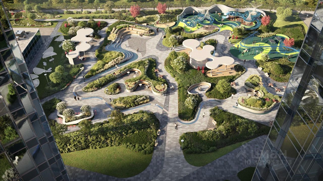 Концепция благоустройства hideOUT — баланс между природой и технологичным городом будущего. На территории сада предусмотрены 15 зон для отдыха, работы, спорта и детей. Знаковым местом станет центральная площадь с амфитеатром и водопадом — сочетание камней, растений и струящейся воды создает идеальный баланс с природой.