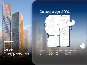 В жилом квартале, расположенном на границе с природным заказником "Долина реки Очаковки", продаётся 3-комнатная квартира площадью 67.10 кв.м без отделки. Квартира расположена на 36 этаже 48-этажного корпуса 8 в жилом комплексе бизнес-класса Level Мичуринский (компания Level Group/Левел групп).