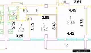 Планировка: жилая площадь — 34.4 м², кухня — 9 м². Высота потолков — 2,8 метра