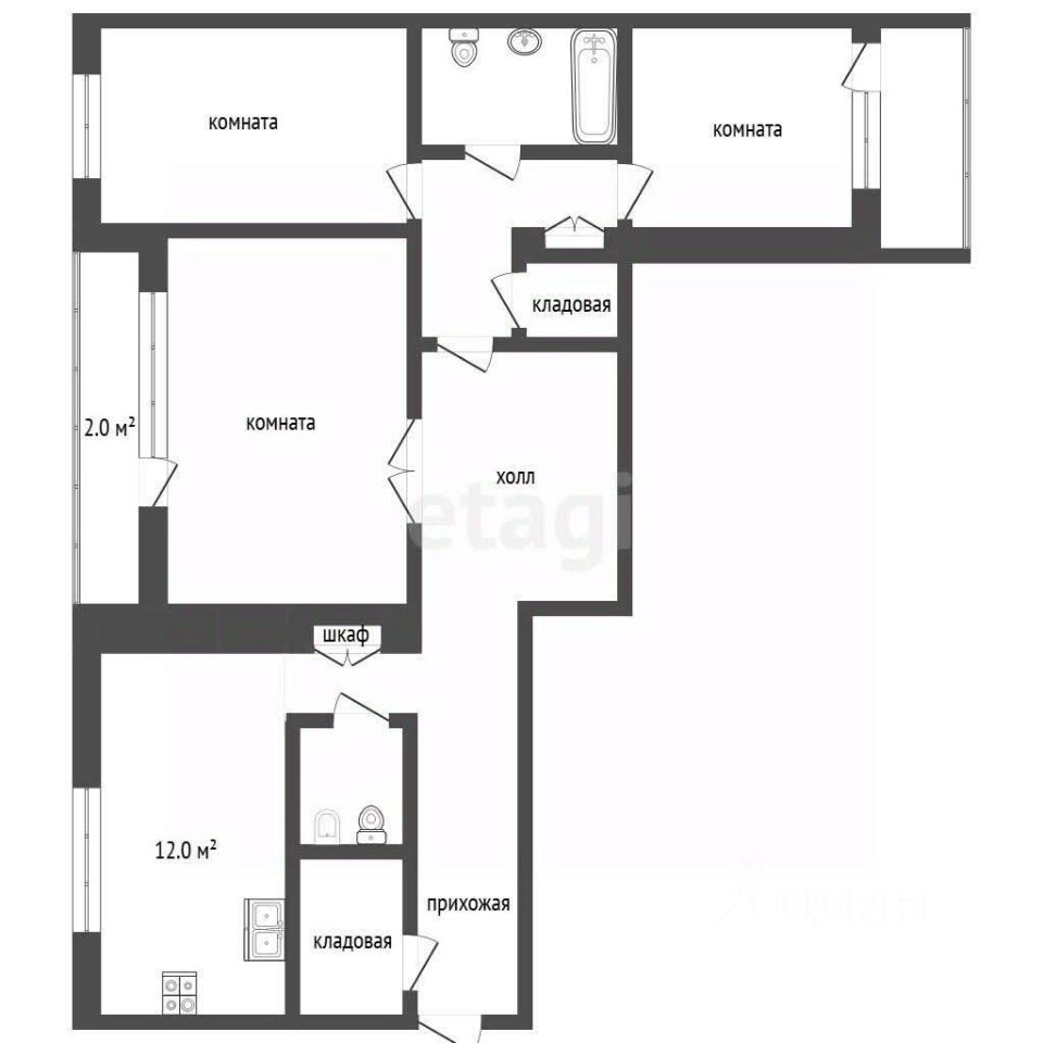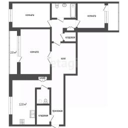 В квартире три изолированные комнаты, кухня 12 кв. м. , два санузла(гостевой и совмещенный), гардеробная, балкон и лоджия.