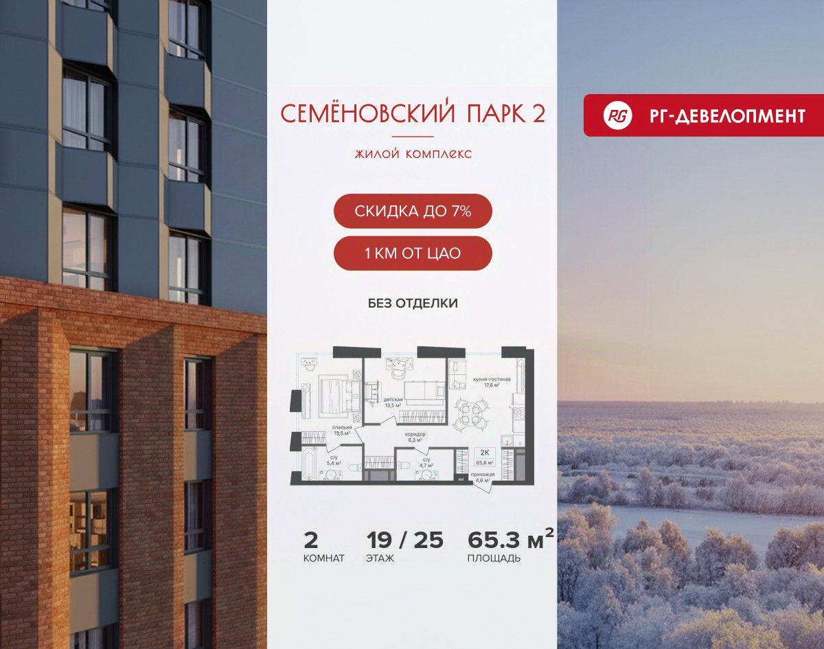 Продается 2-к квартира 65,3 кв.м. в ЖК "Семеновский парк 2" на 19-м этаже 25 этажного дома.