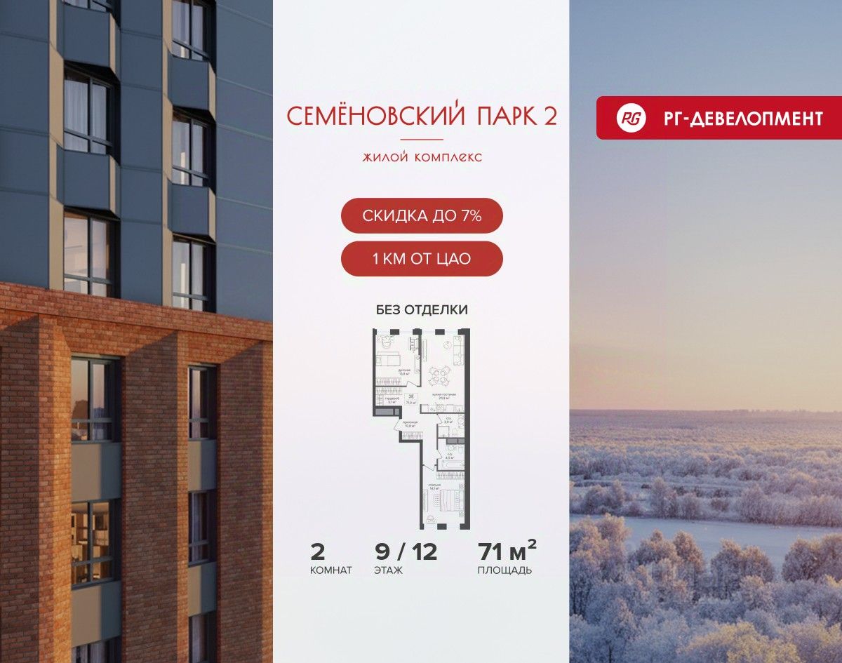 Продается 2-к квартира 71,0 кв.м. в ЖК "Семеновский парк 2" на 9-м этаже 12 этажного дома.