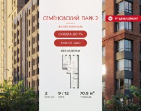 Продается 2-к квартира 70,9 кв.м. в ЖК "Семеновский парк 2" на 9-м этаже 12 этажного дома.