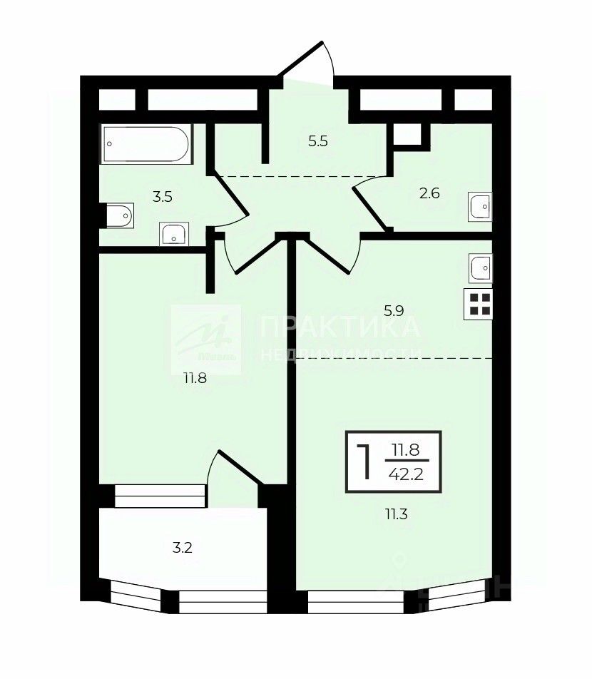 кухня-гостиная = 11,8 м2спальня 11,8 м2 с нишей под гардероб + лоджия 3,2 м, в которой можно обустроить рабочее местопервый с/узел с ванной 3,5 м2 полностью оборудован сантехникойвторой с/узел 2,6 м2 - можно организовать тех. комнату/постирочную с местами для хранения вещей.