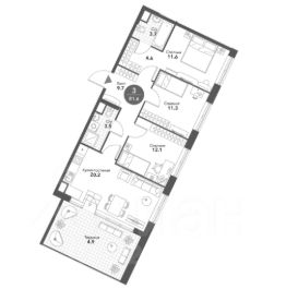 4 спальные комнаты: 12.1-11.6-11.3-10.1 м²