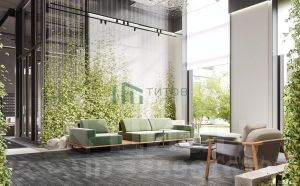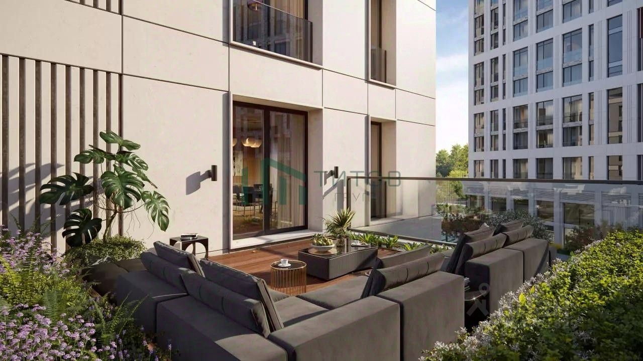 Окна квартиры выходят во внутренний двор с потрясающим озеленением и уютным променадом.