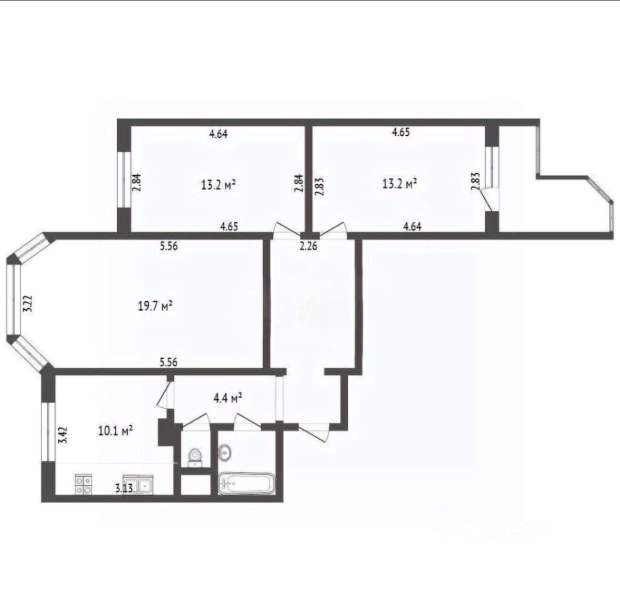 Квартира расположена на 7 этаже 14-этажного панельного дома, построенного в 2004 году. Общая площадь составляет 81 кв. м, жилая — 46,1 кв. м, площадь кухни — 10,1 кв. м. Комнаты изолированы: 13,2+13,2+19,7 кв. м. Высота потолков — 2,85 м. Квартира не угловая, без мебели, есть лоджия.