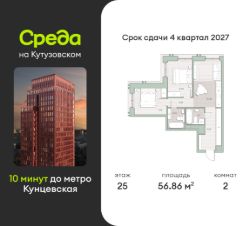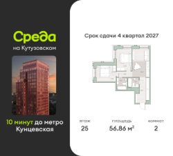 Продаётся 2-комнатная квартира общей площадью 56.86 кв.м. с отделкой white box. Квартира расположена на 25 этаже корпуса 5 в жилом комплексе бизнес-класса "Среда на Кутузовском" в пешей доступности от метро "Кунцевская".