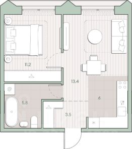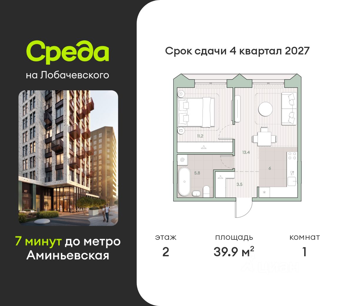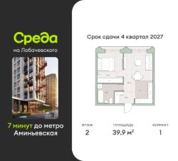 Продаётся 1-комнатная квартира общей площадью 39.9 кв.м. без отделки. Квартира расположена на 2 этаже корпуса 5.7 в жилом комплексе бизнес-класса "Среда на Лобачевского" в пешей доступности от метро "Аминьевская".