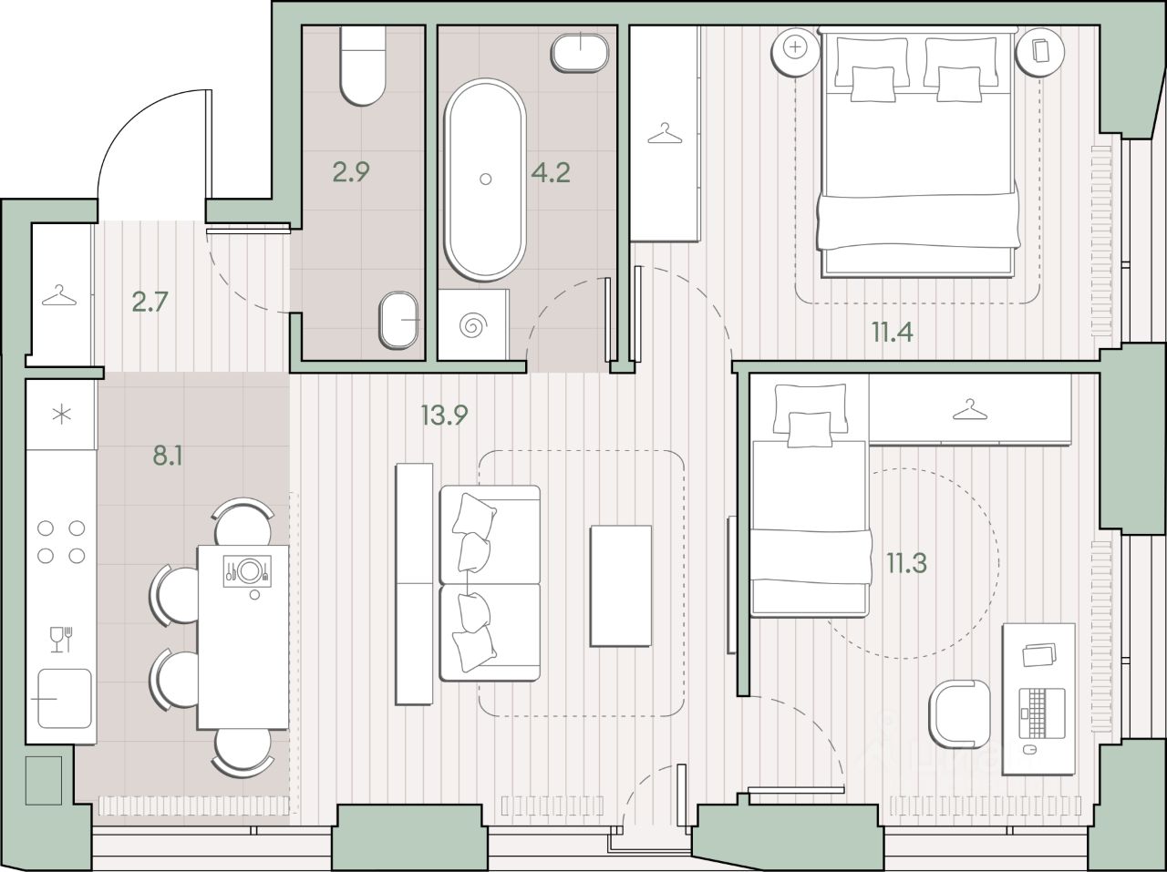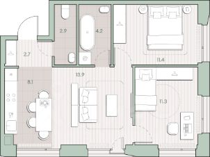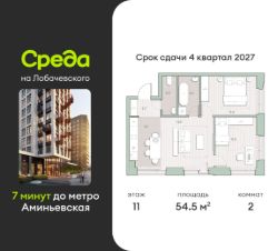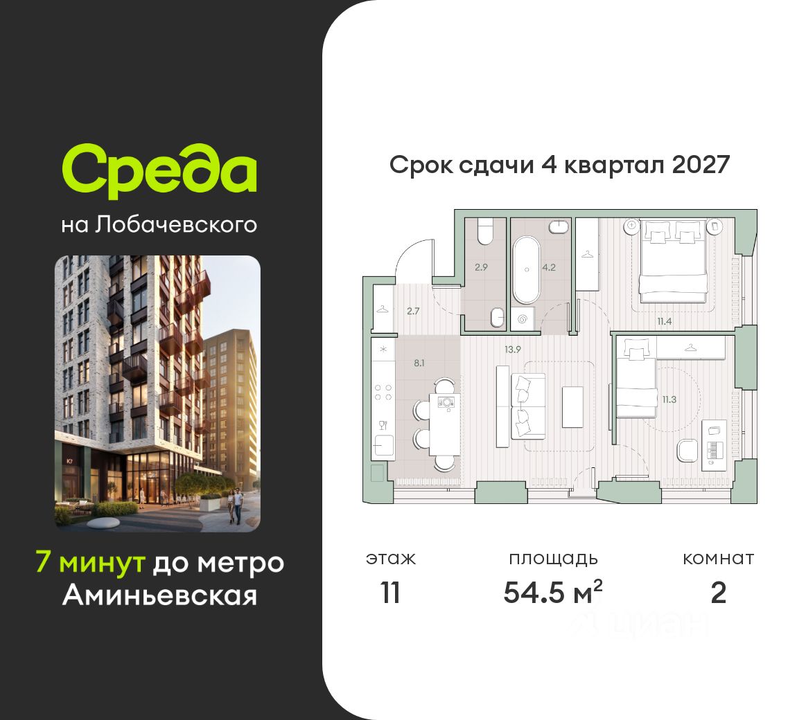 Продаётся 2-комнатная квартира общей площадью 54.5 кв.м. без отделки. Квартира расположена на 11 этаже корпуса 5.5 в жилом комплексе бизнес-класса "Среда на Лобачевского" в пешей доступности от метро "Аминьевская".