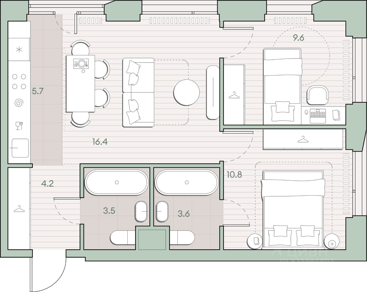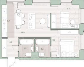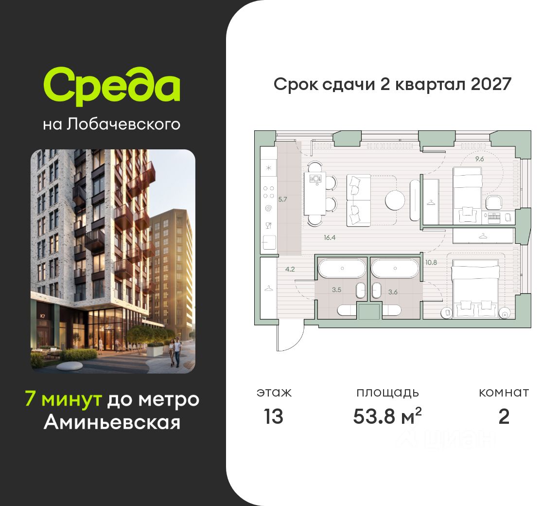 Продаётся 2-комнатная квартира общей площадью 53.8 кв.м. с отделкой white box. Квартира расположена на 13 этаже корпуса 5.4 в жилом комплексе бизнес-класса "Среда на Лобачевского" в пешей доступности от метро "Аминьевская".