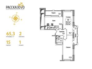 Продается 2-комнатная квартира в ЖК Рассказово на 10 этаже. Общая площадь квартиры составляет 65,3 кв.м. Квартира без отделки.
